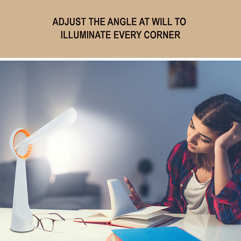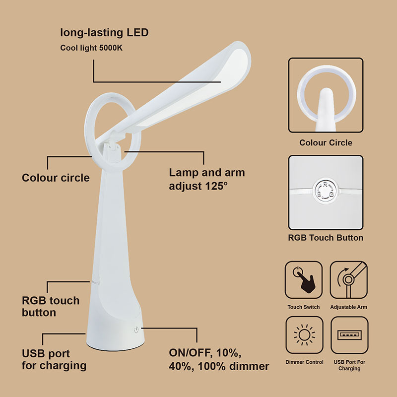 အပြင်အဆင် rgb LED စားပွဲခုံ မီးလင်းသည် ထုတ်ကုန်ကိုယ်ထည်ပေါ်တွင် 3 မှိန်မှိန်သွားနိုင်သည်။ LED မီးခေါင်းသည် 125° အမြင့်ဆုံးဖွင့်နိုင်သည်။