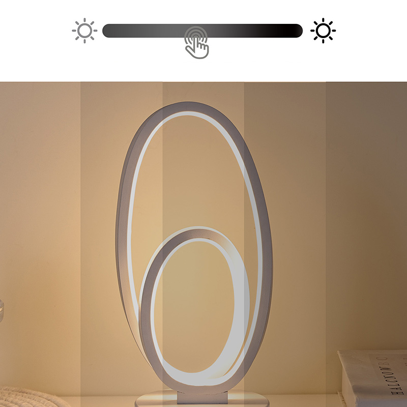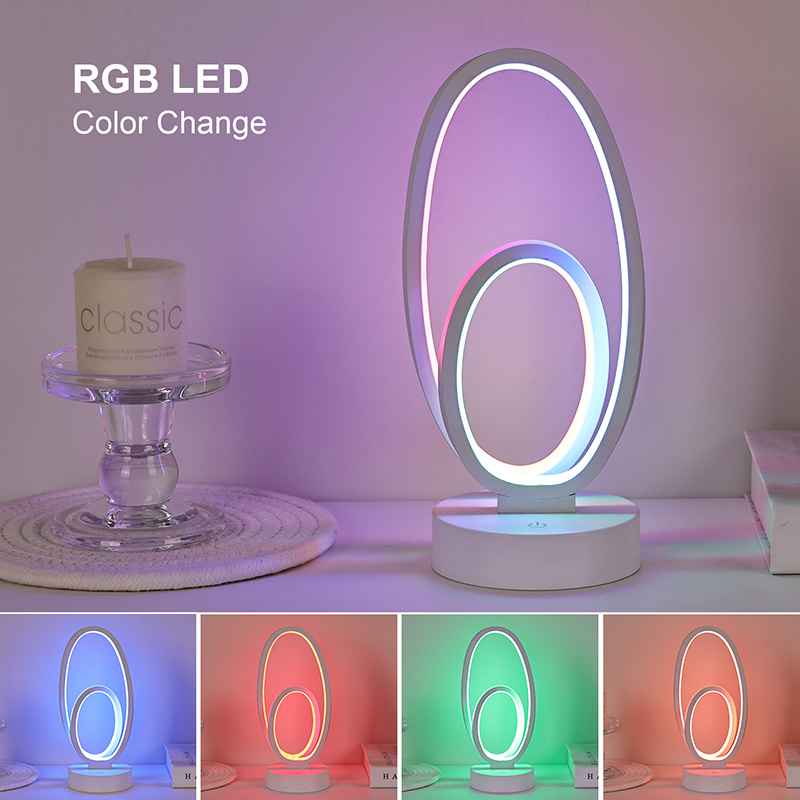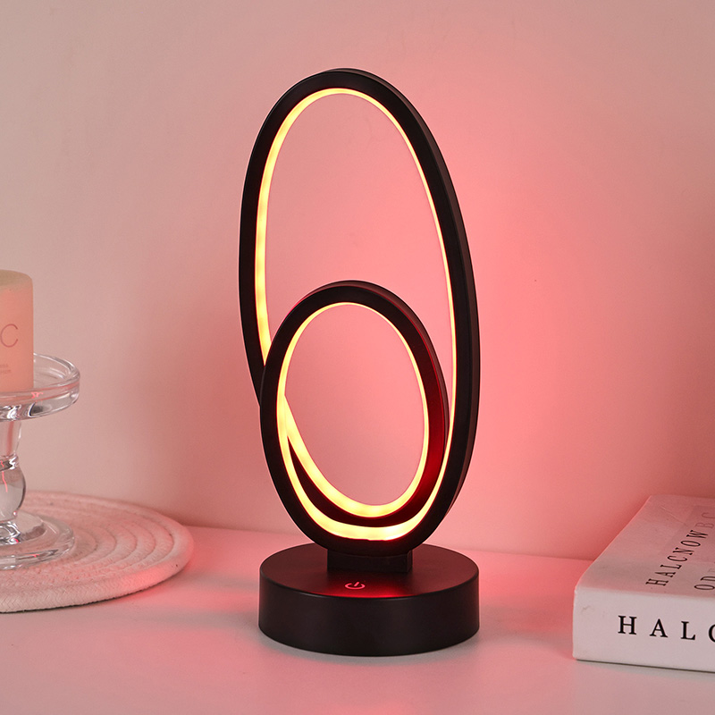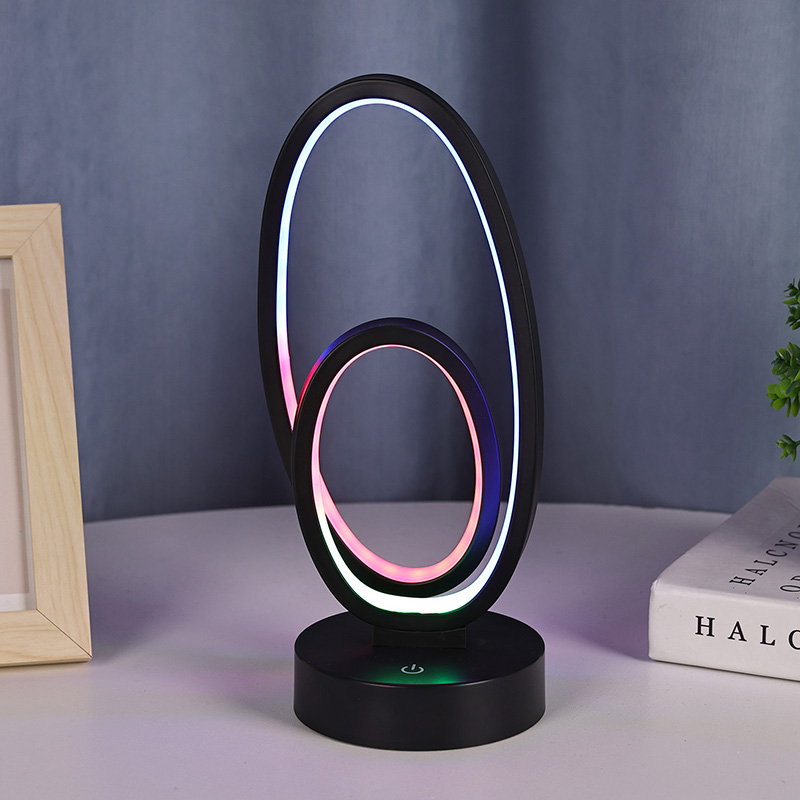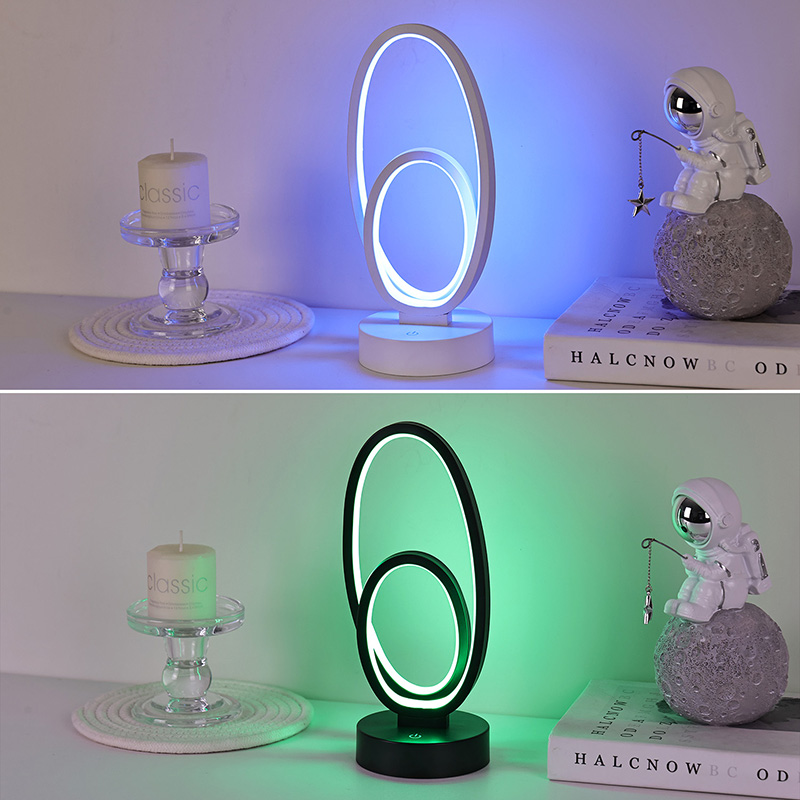 44*33*H23.5cmDouble Circular Ring Shade RGB Desk Lamp သည် သေးငယ်သော မျဉ်းကြောင်းများဖြင့် ကြော့ရှင်းသော အသွင်အပြင်များဖြင့် နှစ်ထပ်ကွင်းဒီဇိုင်းပါရှိသည်။ သတ္တုနှင့် အရည်အသွေးမြင့် ပလပ်စတစ်တို့ကို ပေါင်းစပ်ထားသောကြောင့် ထူးခြားသော အသွင်အပြင်နှင့် နူးညံ့သိမ်မွေ့သော အထိအတွေ့ကို ရရှိသည်။ အလင်းရောင်ပေးသည့်ကိရိယာအပြင်၊