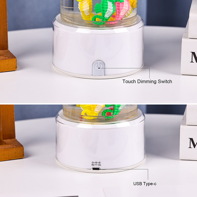 သမုဒ္ဒရာ၏ ငြိမ်သက်မှုကို စွဲမက်ဖွယ်ကောင်းသော ရေအောက်မြင်ကွင်း တစ်ခုလုံးကို အရည်အသွေးမြင့် တာရှည်ခံပလပ်စတစ်ဖြင့် ပြုလုပ်ထားပြီး ဘေးကင်းမှု တည်ငြိမ်မှုနှင့် ကြာရှည်စွာ စွမ်းဆောင်နိုင်မှုတို့ကို သေချာစေသည့် မီးခွက်သည် ခန့်မှန်းခြေ 12 လက်မ အမြင့်ရှိပြီး အဆိပ်အတောက်မရှိသော အရည်များနှင့် ရောင်စုံပင်လယ်မြင်းအဆင်တန်ဆာများဖြင့် ပြည့်နှက်နေသော ဆီမီးခွက်အား အသေးစိတ်ကျစ်လျစ်သော အရောင်အသွေးနှင့် စစ်မှန်သော အရောင်အသွေးစုံလင်သော အသွင်အပြင်ကို အာရုံစူးစိုက်မှုဖြင့် ဖန်တီးပြုလုပ်ထားသည်။ ဆိတ်ငြိမ်သောအတွင်းပိုင်းလည်ပတ်မှုစနစ်ဖြင့် တကယ့်ပင်လယ်ဘဝနှင့်ဆင်တူသော သဘာဝအတိုင်း ယိမ်းနွဲ့လှုပ်ရှားမှုကို ဖန်တီးပေးသည့် ဤနူးညံ့သိမ်မွေ့သောလှုပ်ရှားမှုသည် ကြည့်ရှုရန် စိတ်သက်သာရာရစေပြီး ငြိမ်သက်အေးချမ်းသော အမြင်အာရုံခံစားမှုကို ပေးဆောင်စေပြီး စိတ်ဖိစီးမှုကို လျှော့ချပေးသည်