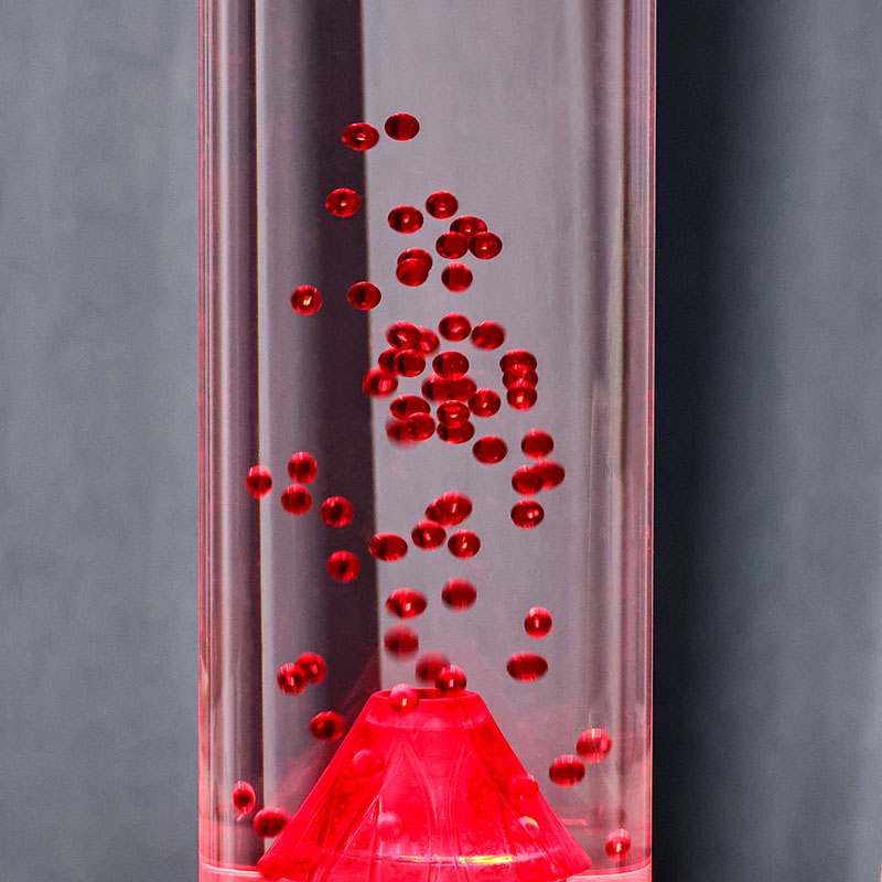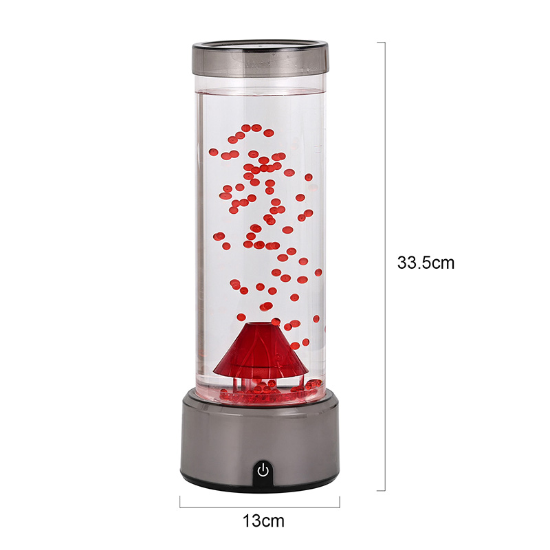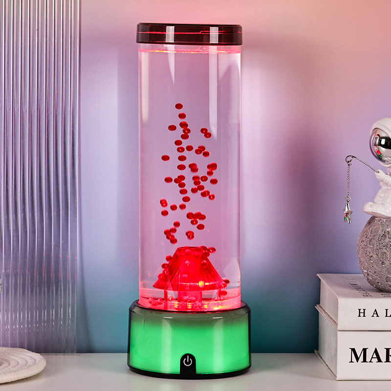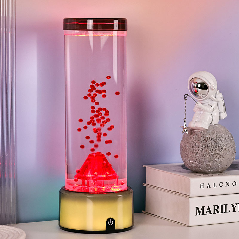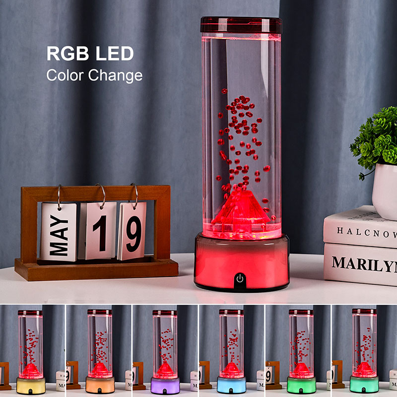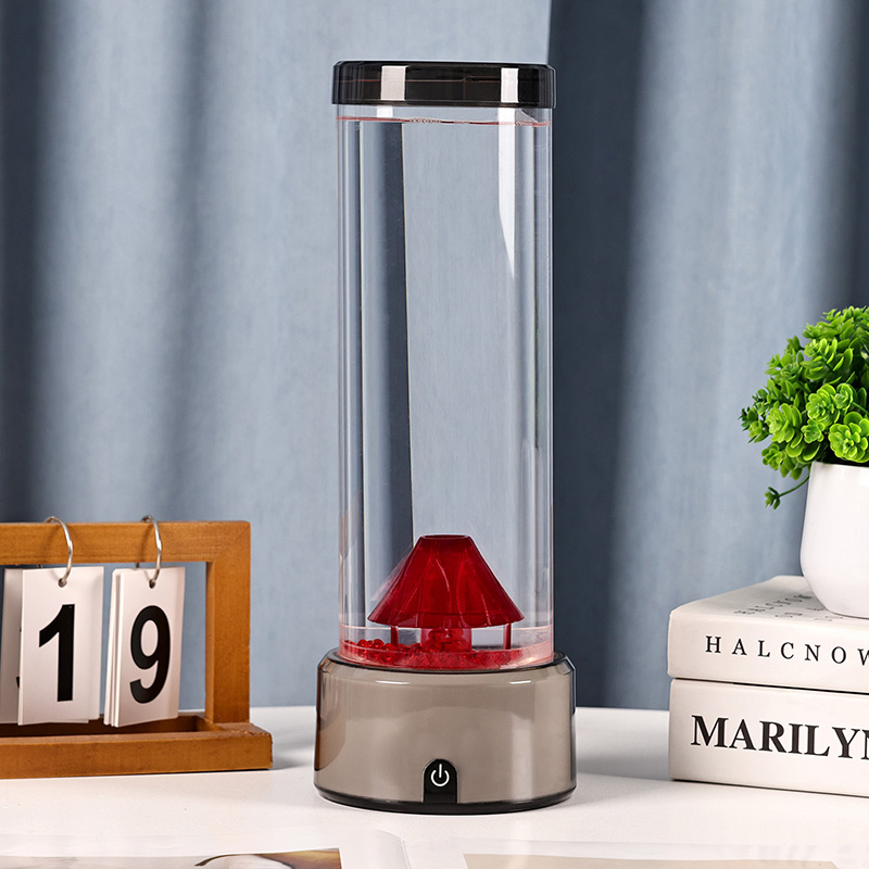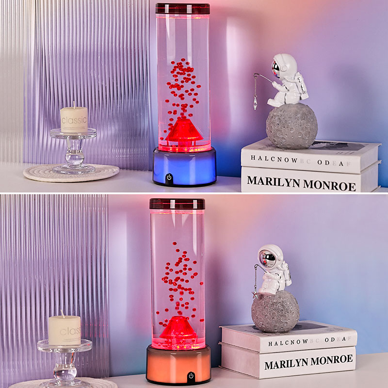 မီးတောင်၏ အလယ်ဗဟိုတွင် မီးတောင်ပုံသဏ္ဍာန်နှင့် ဆင်တူစေရန် အနုစိတ်ဒီဇိုင်းထုတ်ထားသည့် အသေးစား မီးတောင်ပုံစံတစ်ခုရှိသည်။ ပါဝါဖွင့်ထားသောအခါတွင်၊ မီးတောင်သည် “ပေါက်ကွဲသည်” ဖြစ်ကာ အနီရောင်အမှုန်အမွှားများကို အရည်ကော်လံမှတဆင့် အထက်သို့ ဆက်တိုက် စည်းချက်ကျကျ ရွေ့လျားစေသည်။ အထူးထုတ်လုပ်ထားသော အဆိပ်အတောက်မရှိသော အရည်တွင် ဆိုင်းငံ့ထားသည့် ဤအမှုန်များသည် ချော်ရည်ပူဖောင်းများကဲ့သို့ မြင့်တက်ကာ ပြိုလဲကာ အသက်ဝင်နေသော မီးတောင်ကို အမှတ်ရစေသည့် ညှို့ဓာတ်အကျိုးသက်ရောက်မှုကို ဖန်တီးပေးသည်။ ရွေ့လျားမှုကို သေးငယ်သော အတွင်းပန့်စနစ်ဖြင့် မောင်းနှင်ထားပြီး အရည်ကို ညင်သာစွာ လည်ပတ်စေပြီး အပူလွန်ကဲခြင်းမရှိဘဲ ကြာရှည်စွာ စွမ်းဆောင်ရည်ကို အာမခံပါသည်။